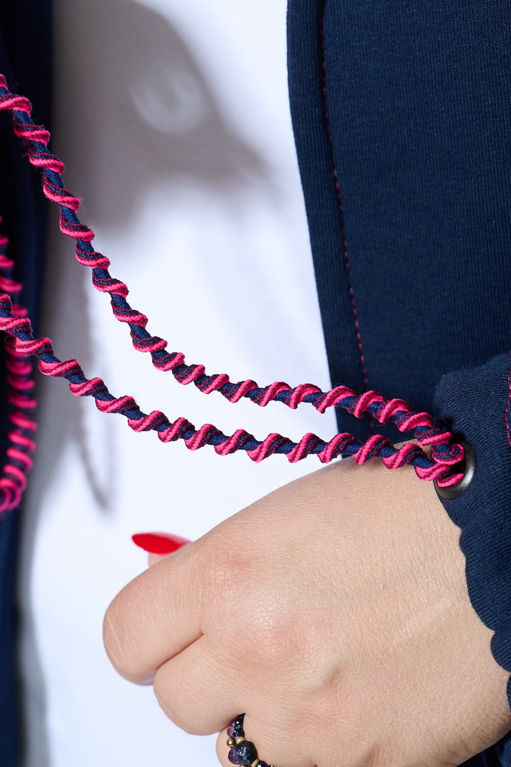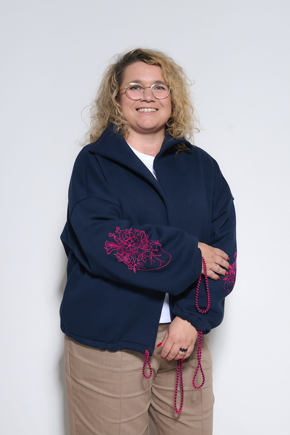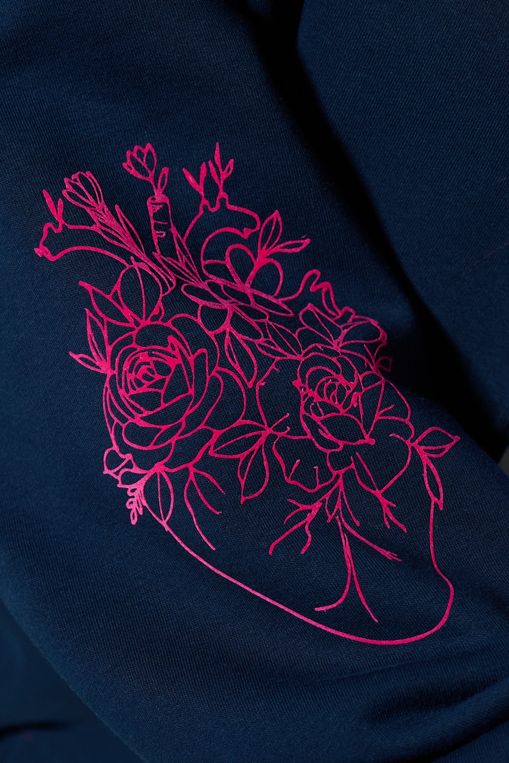 Bluza "Floral Hearts” to połączenie wygody i wyjątkowego stylu. Granatowa, oversize’owa bluza wyróżnia się różowymi haftami kwiatów w kształcie serc na rękawach oraz regulowanymi ściągaczami, które dodają jej charakteru. Wykonana z wysokiej jakości bawełny z elastanem, jest miękka, oddychająca i idealna na każdą porę roku.