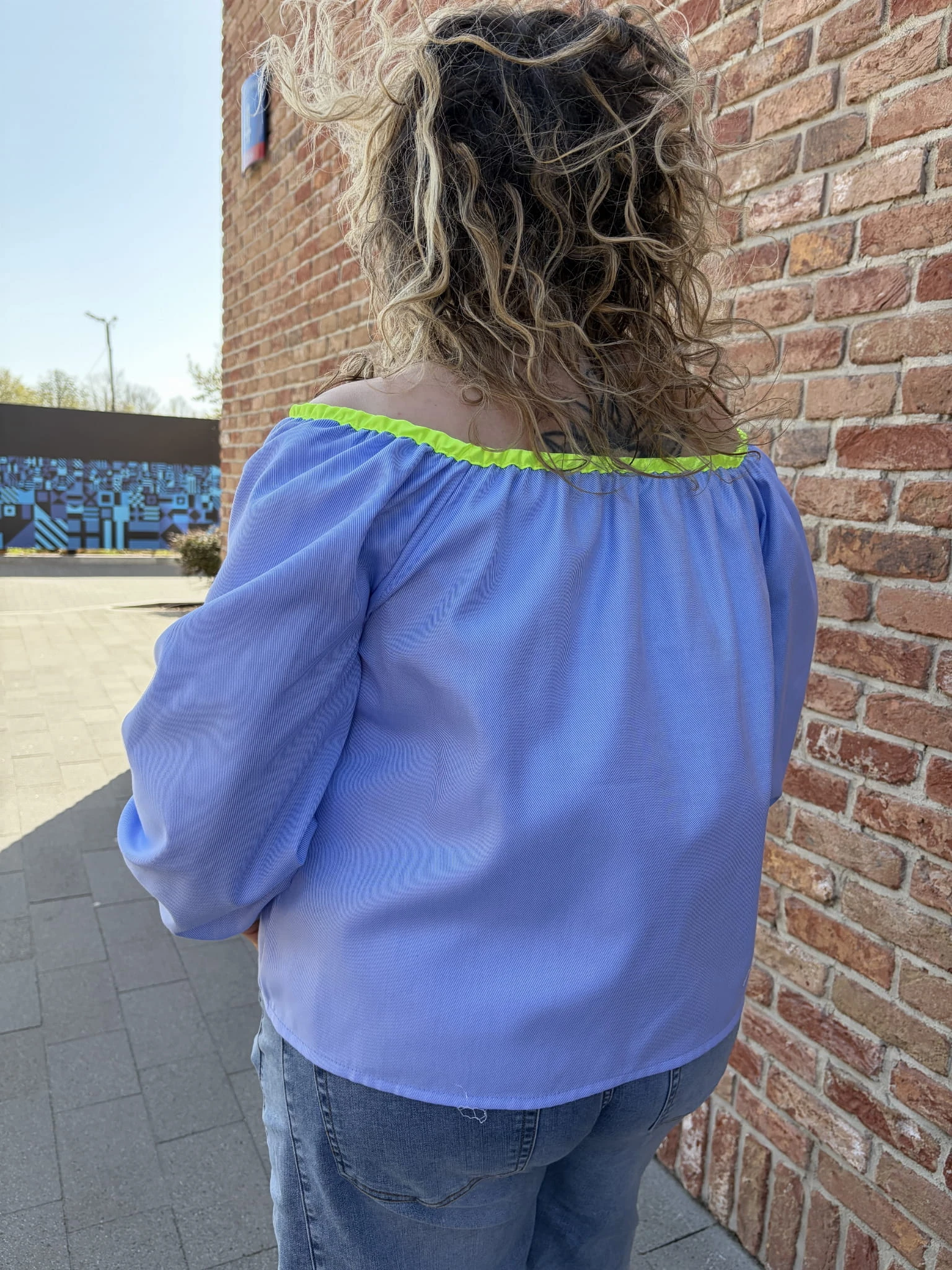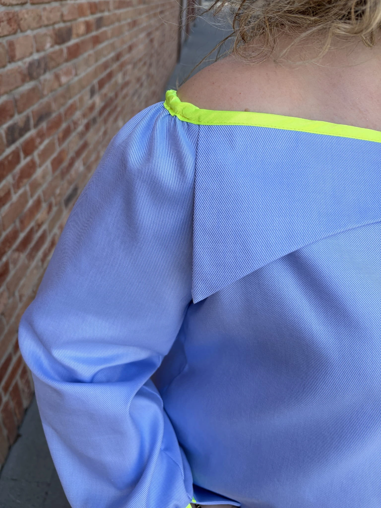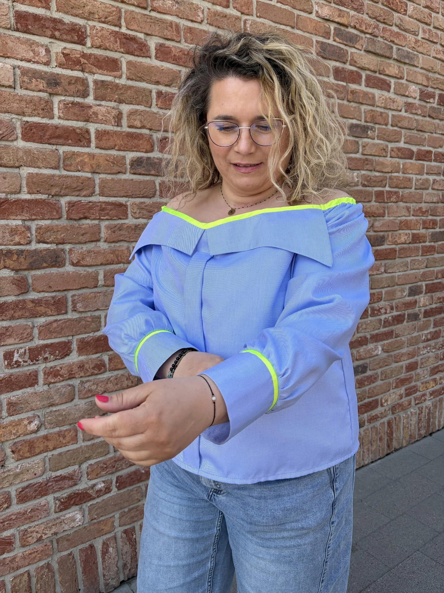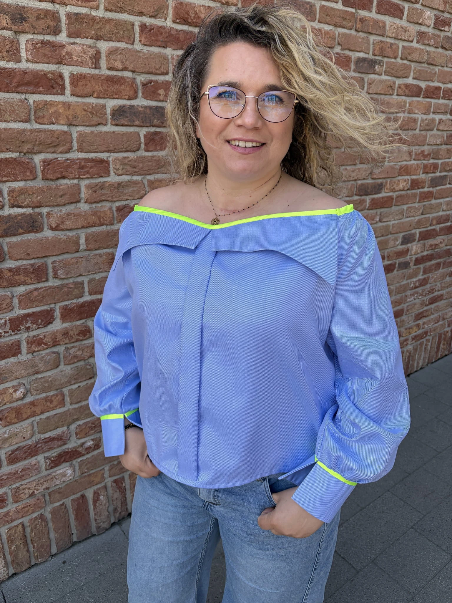 Lekka, miękka tkanina układa się swobodnie na ciele, a odkryte ramiona i wyrazisty kołnierz dodają kobiecości – subtelnie, ale z charakterem. Neonowe wykończenia dodają świeżości i przełamują klasykę.